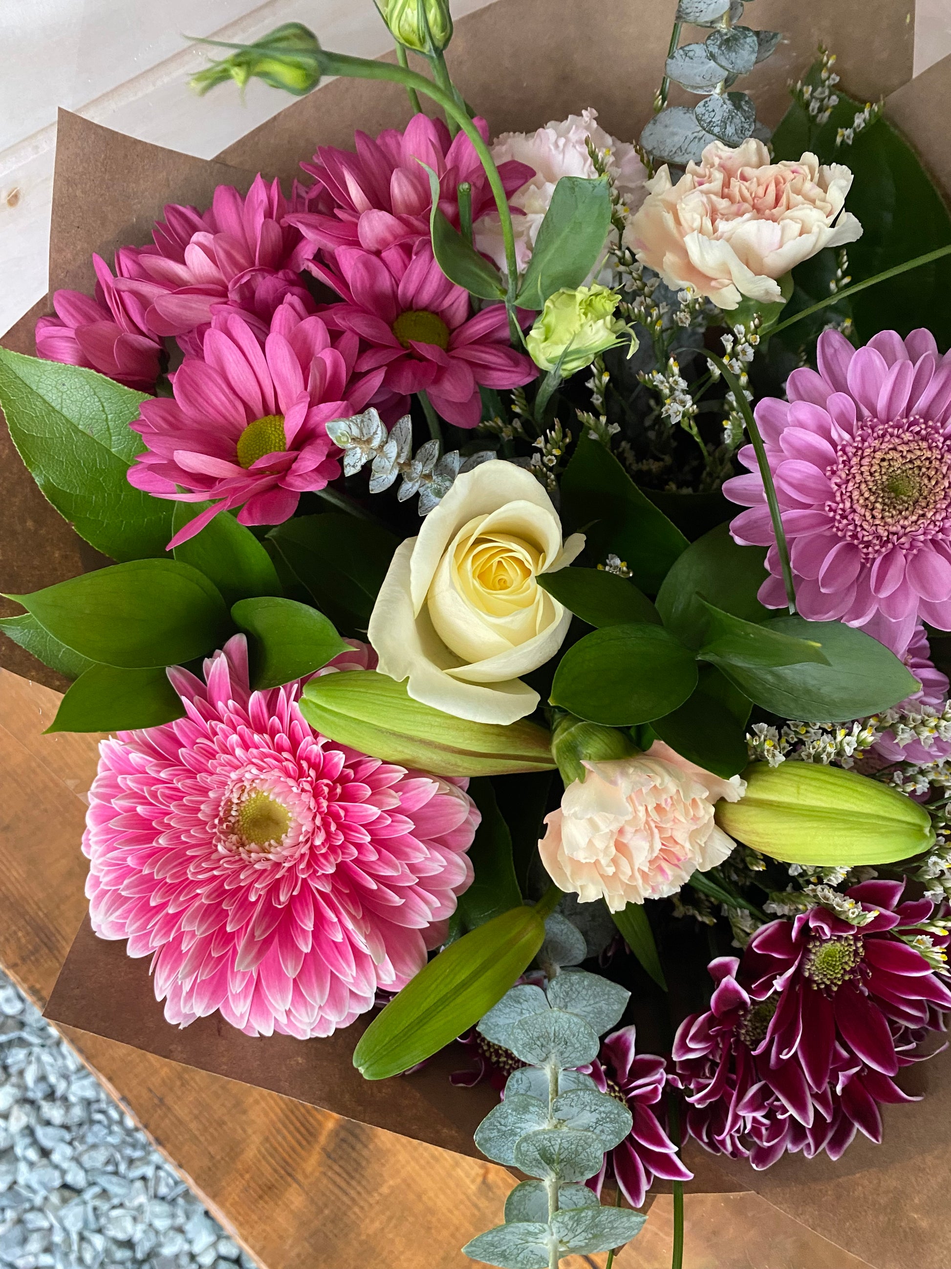 A traditional handtied bouquet is a great gift for those with lots of vases, or those who need a little bit of brightness after a long day! In this particular one, light pinks and deep purples are showcased using beautiful chrysanthemums, roses, gerberas, and lisianthus.